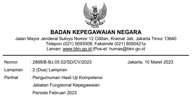 Berkenaan dengan telah dilaksanakannya Uji Kompetensi Jabatan Fungsional Kepegawaian pada tanggal 20 – 24 Februari 2023 dan 27 Februari 2023, bersama ini kami sampaikan hal-hal sebagai berikut: