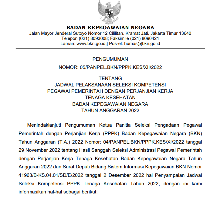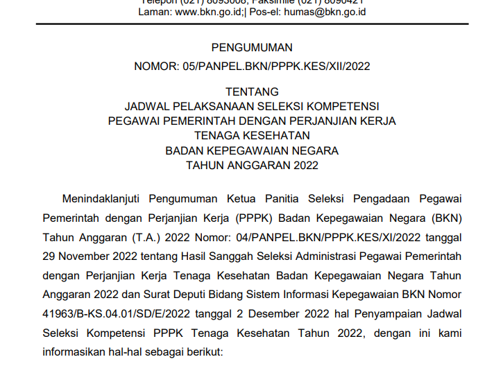 Menindaklanjuti Pengumuman Ketua Panitia Seleksi Pengadaan Pegawai Pemerintah dengan Perjanjian Kerja (PPPK) Badan Kepegawaian Negara (BKN) Tahun Anggaran (T.A.) 2022 Nomor: 04/PANPEL.BKN/PPPK.KES/XI/2022 tanggal 29 November 2022 tentang Hasil Sanggah Seleksi Administrasi Pegawai Pemerintahdengan Perjanjian Kerja Tenaga Kesehatan Badan Kepegawaian Negara Tahun Anggaran 2022 dan Surat Deputi Bidang Sistem Informasi Kepegawaian BKN Nomor 41963/B-KS.04.01/SD/E/2022 tanggal 2 Desember 2022 hal Penyampaian JadwalSeleksi Kompetensi PPPK Tenaga Kesehatan Tahun 2022, dengan ini kami informasikan sebagaimana terlampir pada pengumuman berikut: