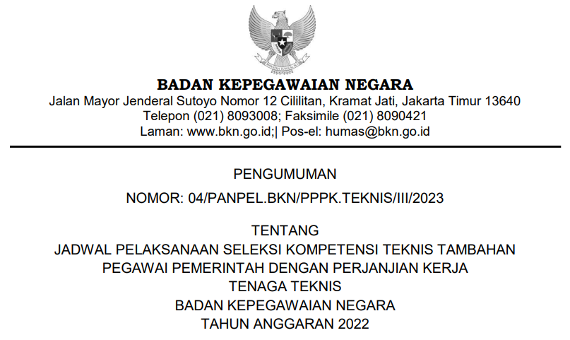 Menyusuli Pengumuman Ketua Panitia Seleksi Pengadaan Pegawai Pemerintah dengan Perjanjian Kerja (PPPK) Badan Kepegawaian Negara (BKN) Tahun Anggaran (T.A.) 2022 Nomor: 03/PANPEL.BKN/PPPK.TEKNIS/II/2023 tanggal 7 Maret 2023 tentang Penyesuaian Jadwal Tahapan Seleksi dan Pelaksanaan Seleksi Kompetensi Pegawai Pemerintah dengan Perjanjian Kerja Tenaga Teknis Badan Kepegawaian Negara Tahun Anggaran 2022, kami informasikan sebagaimana terlampir pada pengumuman berikut: