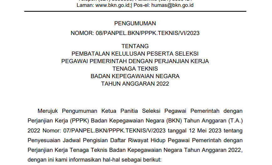 Pengumuman Pembatalan Kelulusan Peserta Seleksi PPPK Tenaga Teknis BKN TA 2022