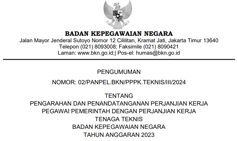 Merujuk pada Pengumuman Ketua Panitia Seleksi Pengadaan Pegawai Pemerintah dengan Perjanjian Kerja (PPPK) Badan Kepegawaian Negara (BKN) Tahun Anggaran (T.A.) 2023 Nomor: 02/PANPEL.BKN/PPPK.TEKNIS/III/2024 tanggal 14 Maret 2024 tentang Pengarahan dan Penandatanganan Perjanjian Kerja Pegawai Pemerintah dengan Perjanjian Kerja Tenaga Teknis Badan Kepegawaian Negara Tahun Anggaran 2023, dengan ini kami informasikan hal-hal sebagaimana terlampir sebagai berikut: