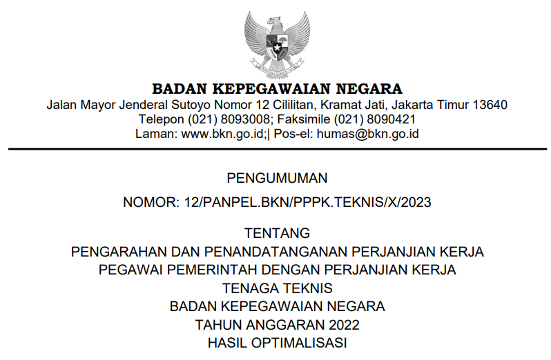 Pengumuman Pengarahan Dan Penandatanganan PPPK Tenaga Teknis BKN TA 2022 Hasil Optimalisasi