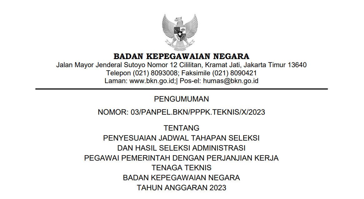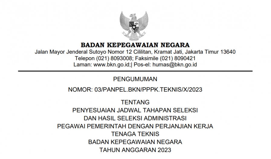 Menindaklanjuti Surat Plt. Kepala Badan Kepegawaian Negara Nomor 9386/BKS.04.01/SD/E/2023 tanggal 9 Oktober 2023 hal Penyesuaian Jadwal Pelaksanaan Seleksi CASN Tahun Anggaran 2023, maka jadwal pelaksanaan seleksi sebagaimana tersebut dalam Pengumuman Ketua Panitia Seleksi Pengadaan Pegawai Pemerintah dengan Perjanjian Kerja (PPPK) Badan Kepegawaian Negara (BKN) Tahun Anggaran (T.A.) 2023 Nomor: 02/PANPEL.BKN/PPPK.TEKNIS/IX/2023 tanggal 18 September 2023 tentang Perubahan Jadwal Pelaksanaan Seleksi Pegawai Pemerintah dengan Perjanjian Kerja Tenaga Teknis Badan Kepegawaian Negara Tahun Anggaran 2023 disesuaikan menjadi sebagaimana terlampir: