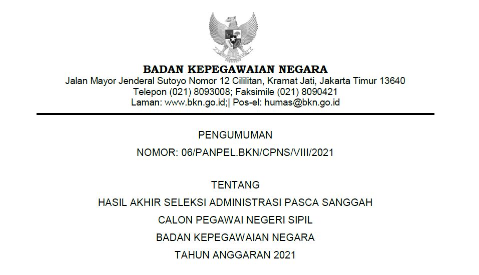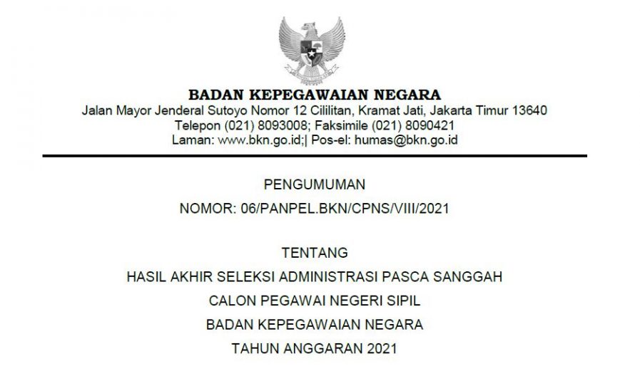 Menindaklanjuti Surat Plt. Kepala Badan Kepegawaian Negara Nomor 6201/B-KS.04.01/SD/K/2021 tanggal 19 Juli 2021 perihal Penyesuaian Jadwal Tahapan Pelaksanaan Seleksi Calon ASN Tahun 2021 dan dalam rangka memberikan kesempatan yang lebih luas kepada masyarakat untuk mengikuti Seleksi Calon Pegawai Negeri Sipil (CPNS) Badan Kepegawaian Negara (BKN) Tahun Anggaran (T.A.) 2021, maka perlu dilakukan perpanjangan masa pendaftaran dan penyesuaian jadwal tahapan pelaksanaan seleksi sebagaimana tersebut dalam Pengumuman Nomor: 01/PANPEL.BKN/CPNS/VI/2021 tentang Seleksi Calon Pegawai Negeri Sipil Badan Kepegawaian Negara Tahun Anggaran 2021,