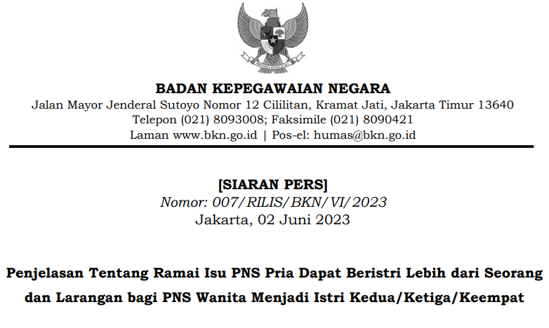 Demikian penjelasan tentang ramainya isu di media massa dan media sosial tentang PNS Pria dapat beristri lebih dari satu dan tentang larangan bagi PNS Wanita menjadi Istri Kedua, Ketiga, atau Keempat. Diimbau dengan hormat kepada rekan awak media untuk dapat mengutip substansi aturan ini secara utuh, sehingga tidak menimbulkan kebingungan di tengah masyarakat.