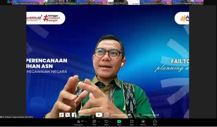 Rapat penyesuaian peta jabatan dan persiapan penetapan NIP CPNS dan PPPK 2024 ini sendiri dihadiri oleh perwakilan admin SIASN Instansi, Biro/Bagian Organisasi,SDM/BKD/BKPP/BKPSDM di seluruh wilayah kerja Kantor Regional BKN I-IV. Kegiatan ini berlangsung mulai Kamis s.d Rabu/16 s.d 22 Januari 2025 secara daring.