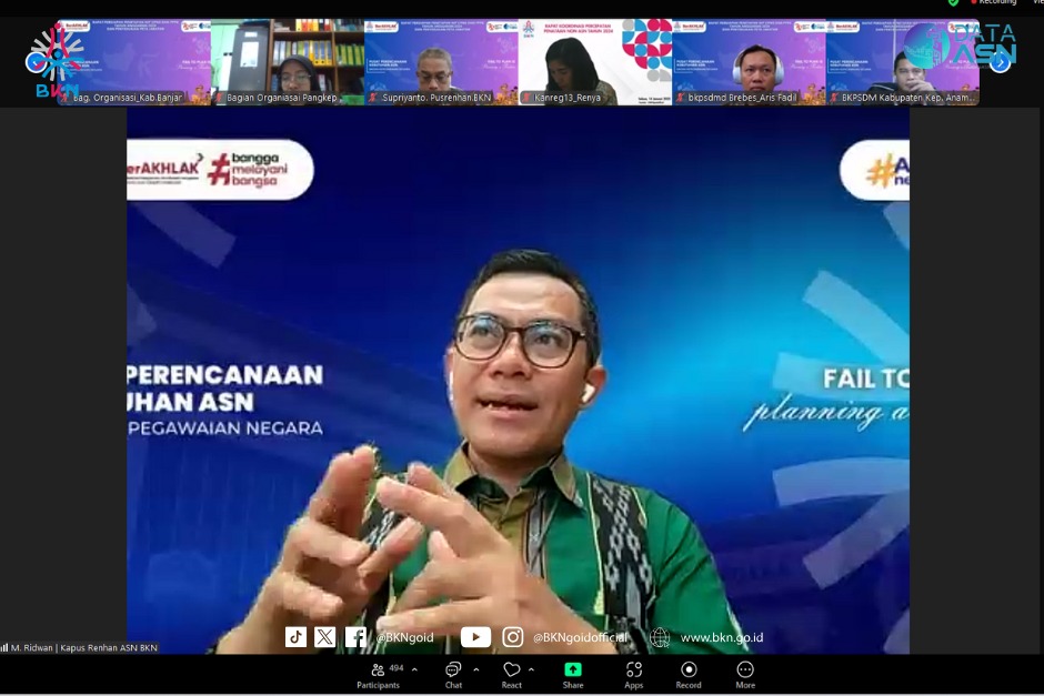 Rapat penyesuaian peta jabatan dan persiapan penetapan NIP CPNS dan PPPK 2024 ini sendiri dihadiri oleh perwakilan admin SIASN Instansi, Biro/Bagian Organisasi,SDM/BKD/BKPP/BKPSDM di seluruh wilayah kerja Kantor Regional BKN I-IV. Kegiatan ini berlangsung mulai Kamis s.d Rabu/16 s.d 22 Januari 2025 secara daring.