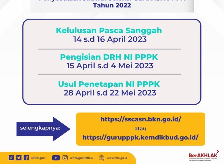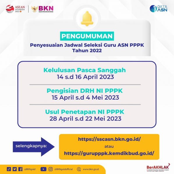 Jakarta – Humas BKN, Berdasarkan surat Direktur Jenderal Guru dan Tenaga Kependidikan Kementerian Pendidikan, Kebudayaan, Riset, dan Teknologi Nomor: 1893/B/GT.01.03/2023 tanggal 10 April 2023 perihal Permohonan Pengolahan Hasil Pascasanggah Seleksi Guru Tahun 2022, Badan Kepegawaian Negara (BKN) kembali menyampaikan penyesuaian jadwal kelanjutan seleksi PPPK Guru Tahun 2022 sesuai dengan keputusan Panselnas.