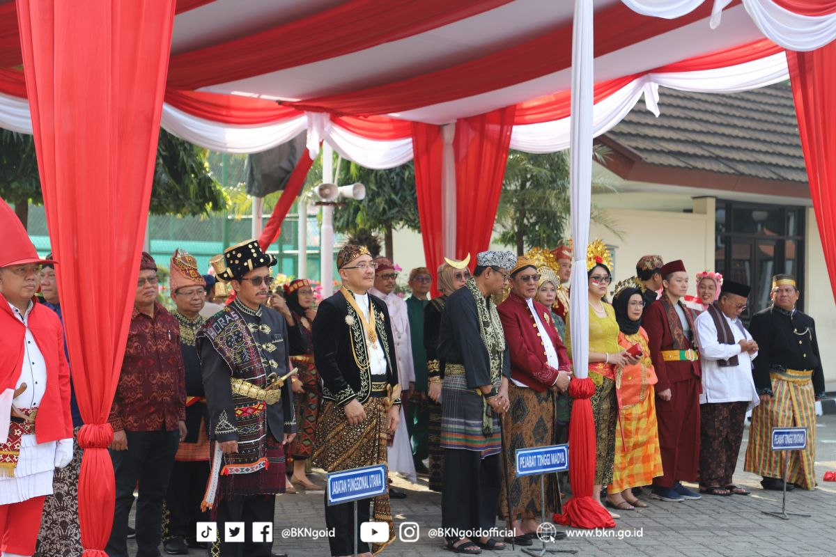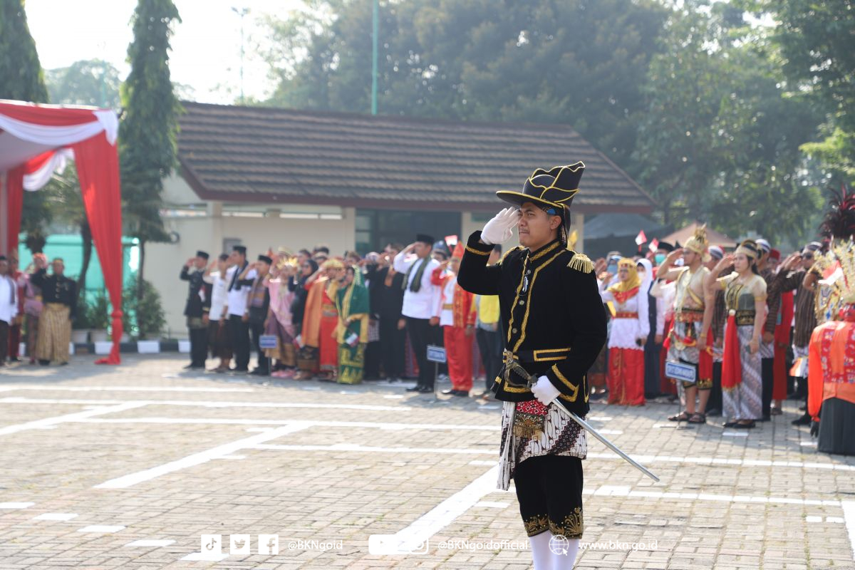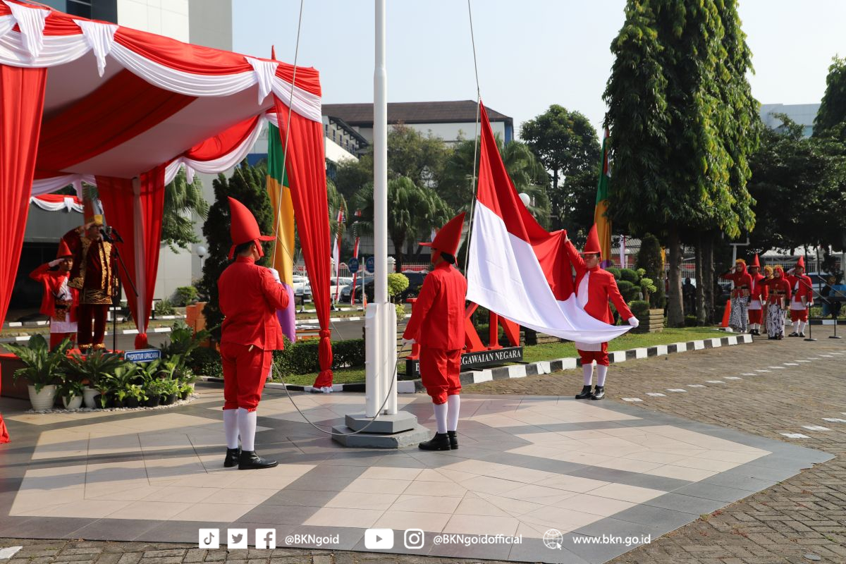 Jakarta – Humas BKN, Upacara Peringatan Detik-detik Proklamasi Kemerdekaan Republik Indonesia di kantor Badan Kepegawaian Negara pusat pada Kamis, (17/8/23) berjalan dengan khidmat. Seluruh Pejabat Pimpinan Tinggi Madya dan Pratama, seluruh pegawai BKN pusat dan perwakilan Dharma Wanita Persatuan BKN yang hadir secara luring semakin menambah semarak perayaan HUT RI ke-78 ini dengan mengenakan pakaian tradisonal nusantara.