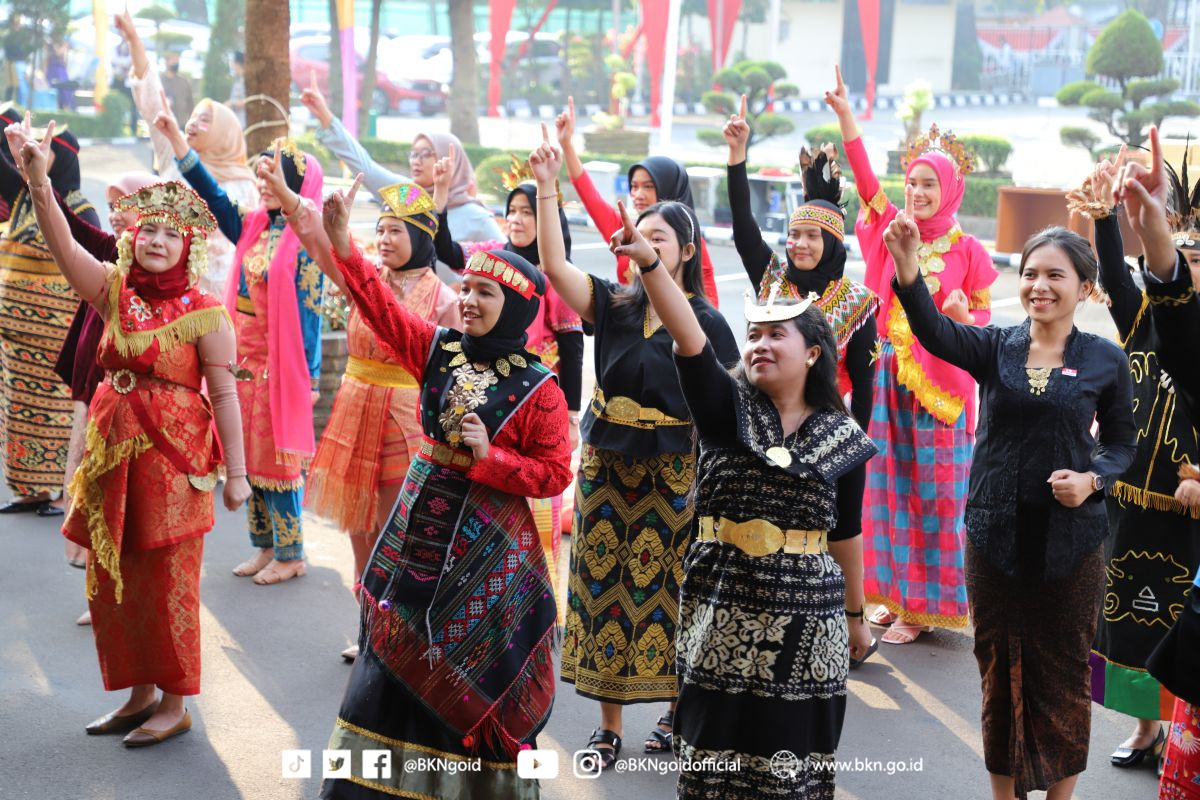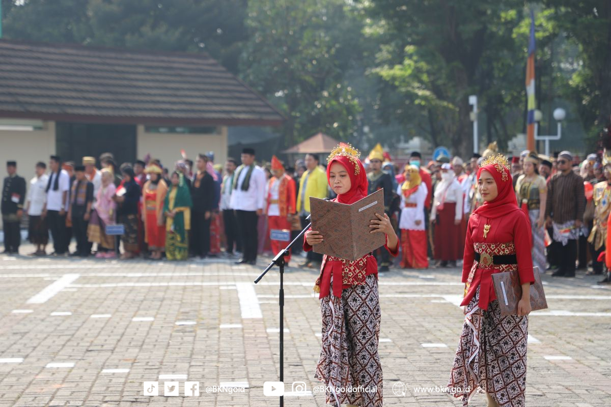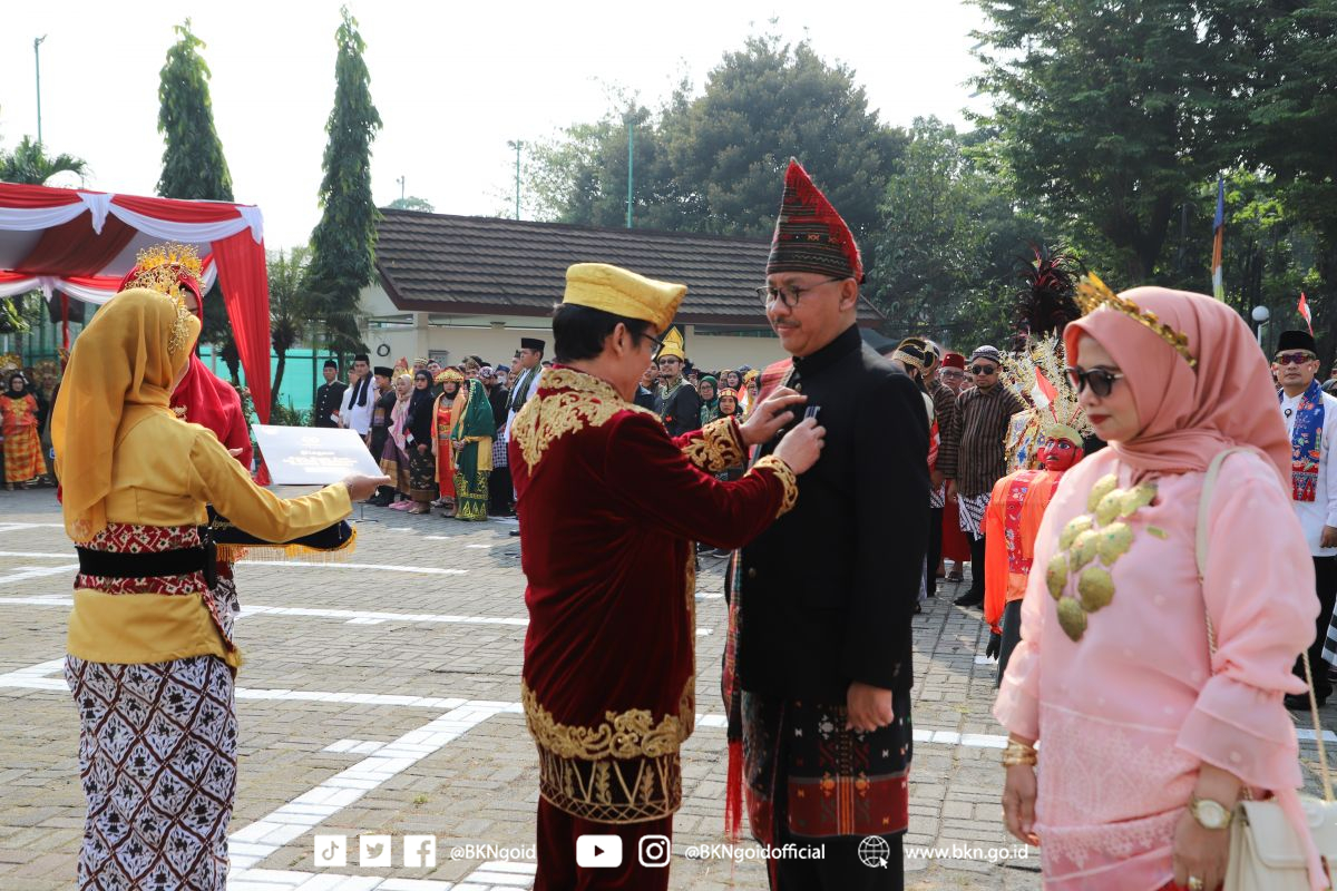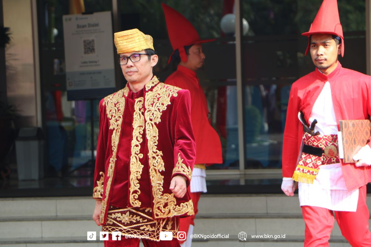 Jakarta – Humas BKN, Upacara Peringatan Detik-detik Proklamasi Kemerdekaan Republik Indonesia di kantor Badan Kepegawaian Negara pusat pada Kamis, (17/8/23) berjalan dengan khidmat. Seluruh Pejabat Pimpinan Tinggi Madya dan Pratama, seluruh pegawai BKN pusat dan perwakilan Dharma Wanita Persatuan BKN yang hadir secara luring semakin menambah semarak perayaan HUT RI ke-78 ini dengan mengenakan pakaian tradisonal nusantara.