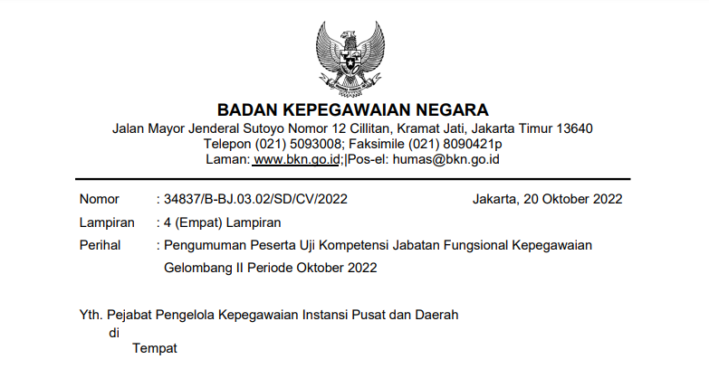 Bersama ini kami sampaikan daftar nama peserta yang akan mengikuti Uji Kompetensi Jabatan Fungsional Kepegawaian Gelombang II Periode Oktober 2022 sebagaimana terlampir. Pelaksanaan Uji Kompetensi Jabatan Fungsional Kepegawaian Gelombang II akan diselenggarakan pada tanggal 24 s.d 31 Oktober 2022, selengkapnya dapat diunduh pada tautan berikut: Peserta Uji Kompetensi Jabatan Fungsional Kepegawaian Gelombang II Periode Oktober 2022