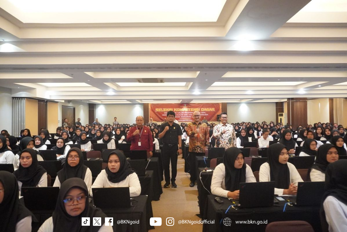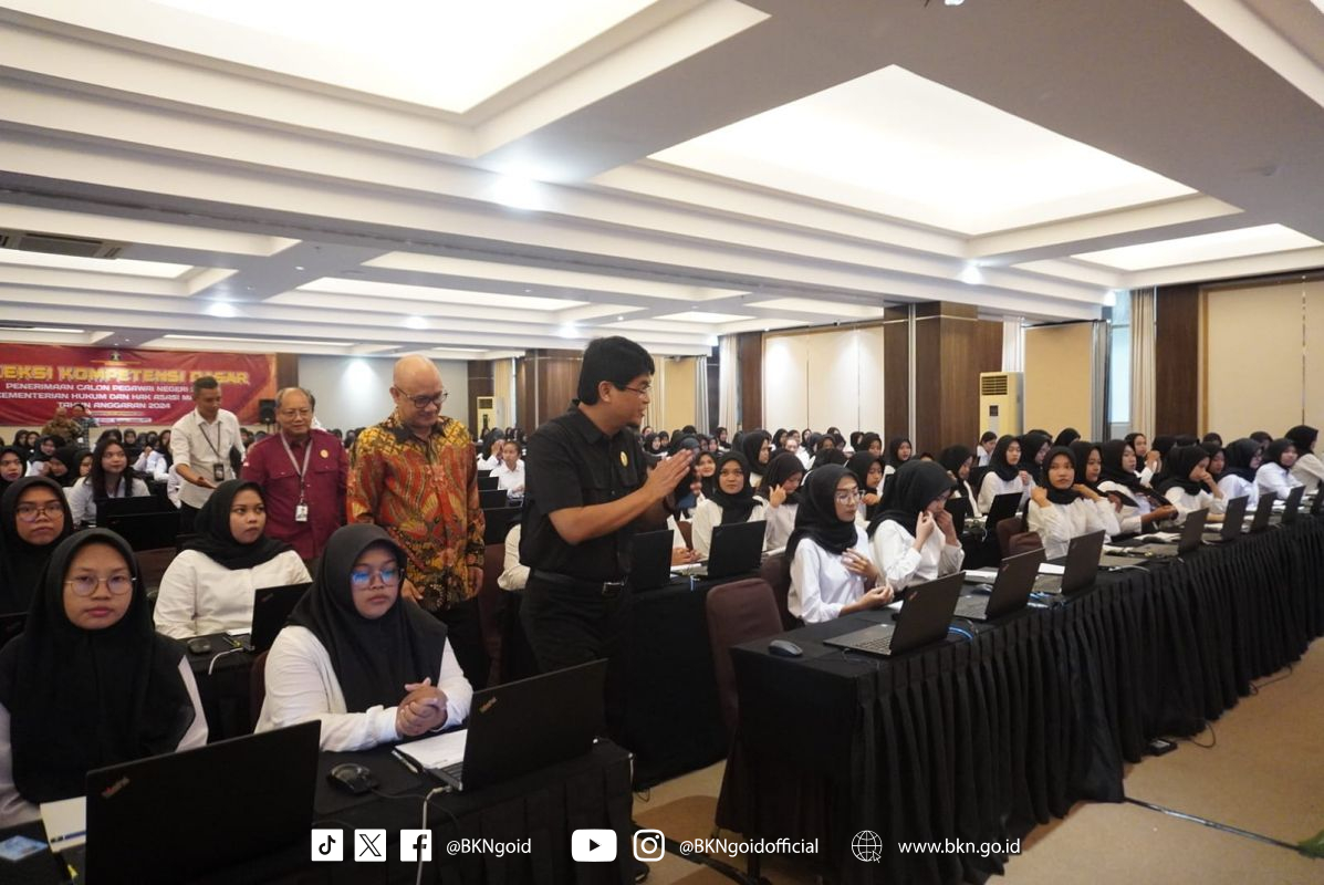 Yogyakarta – Humas BKN, Plt. Kepala BKN Haryomo Dwi Putranto meninjau langsung pelaksanaan SKD CPNS Kemenkumham di Merapi Merbabu Hotel, Sabtu (26/10/2024). Didampingi Kepala Kanreg I BKN Paulus Dwi Laksono serta Kepala Kanwil Kemenkumham DIY Agung Rektono Seto, Haryomo memberikan motivasi dan semangat kepada peserta SKD CPNS Kemenkumham. Haryomo menjelaskan bahwa Seleksi Kompetensi Dasar CPNS 2024 ini menggunakan sistem CAT yang dirancang sedemikian rupa sehingga proses seleksi dilakukan secara obyektif, akuntabel dan transparan sehingga jika ada oknum-oknum yang menjanjikan bisa mengangkat untuk menjadi PNS sudah dipastikan itu adalah penipuan.