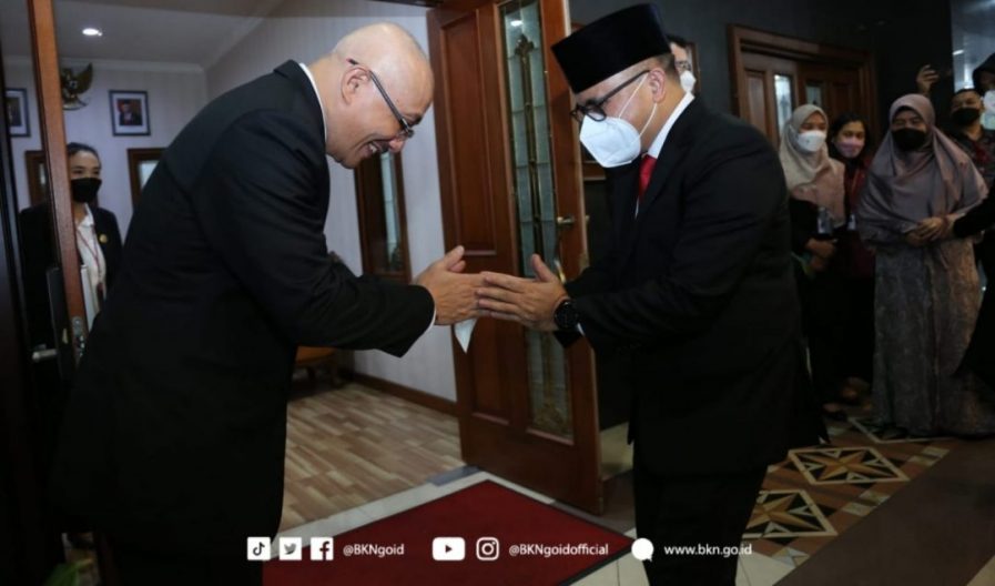 Jakarta – Humas BKN, Plt. Kepala BKN Bima Haria Wibisana, Deputi Bidang Manajemen Kepegawaian Haryomo Dwi Putranto, dan Deputi Bidang Pengawasan dan Pengendalian Otok Kuswandaru menghadiri serah terima jabatan Menteri Pemberdayaan Aparatur Negara dan Reformasi Birokrasi (PANRB) dari Moh Mahfud MD (sebelumnya sebagai Plt. Menteri PANRB) kepada Abdullah Azwar Anas di Ruang Rapat Sriwijaya, di Kantor Kementerian PANRB, Rabu (7/9/2022).