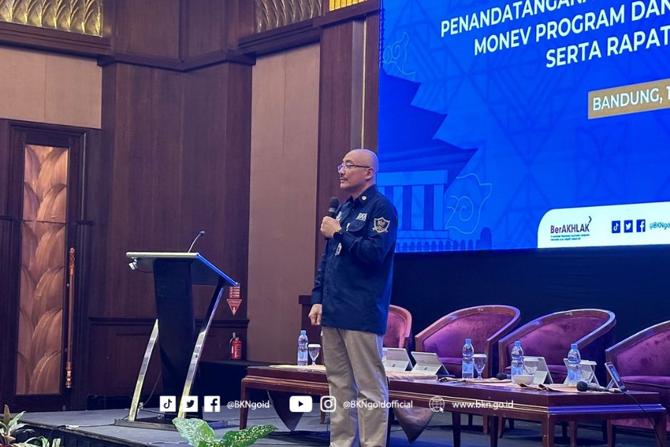 Bandung-Humas BKN, Plt. Kepala Badan Kepegawaian Negara (BKN), Bima Haria Wibisana menekankan bahwa dalam manajemen administrasi kepegawaian harus berbasis digital. “Perubahan digitalisasi ini tidak menunggu Anda, tetapi kita harus beradaptasi,” ujar Bima dalam acara Penandatanganan Perjanjian Kinerja Reform 2023, Rapat Monitoring dan Evaluasi Capaian Kinerja Triwulan IV Tahun Anggaran (TA) 2022 dan Outlook 2023 pada Kamis-Jumat (19-20/1/2023) di El Hotel Royale Bandung. Acara ini dihadiri oleh seluruh Jabatan Pimpinan Tinggi Madya dan Pratama di lingkungan BKN serta perwakilan pegawai dari masing-masing unit kerja.