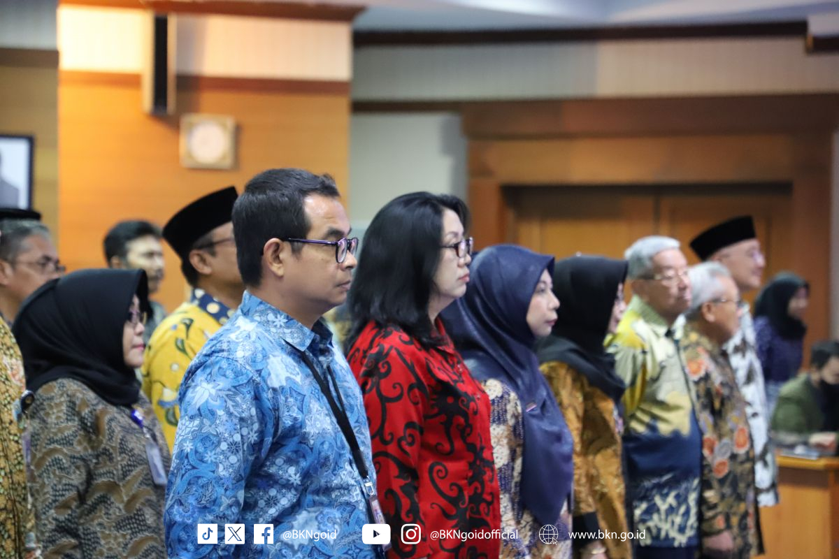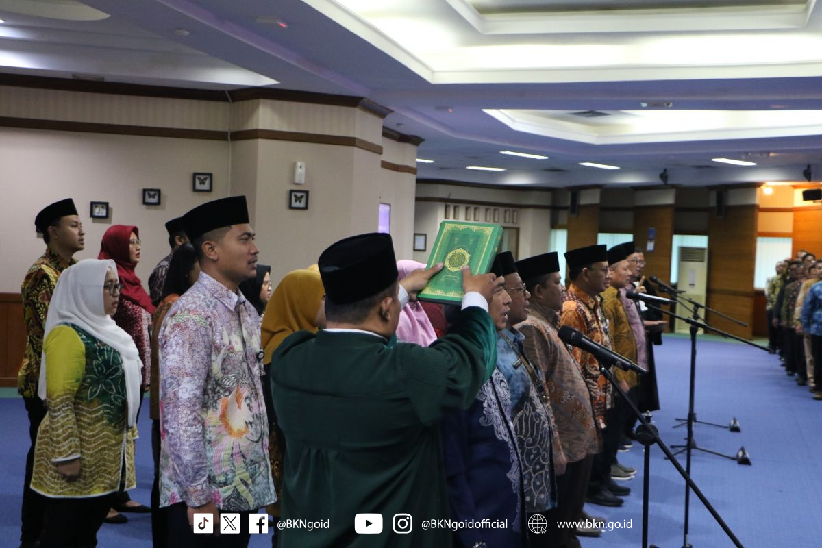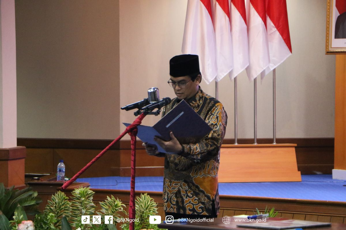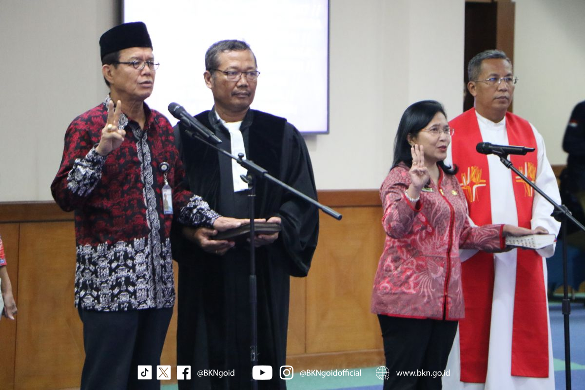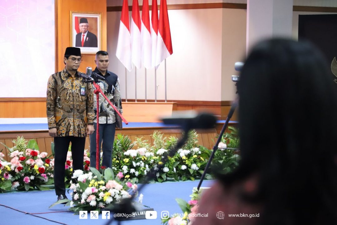 Jakarta – Humas BKN, Plt Kepala Badan Kepegawaian Negara (BKN), Haryomo Dwi Putranto secara resmi melantik dan mengambil sumpah jabatan 2 (dua) Pejabat Fungsional Utama, 7 (tujuh) Pejabat Jabatan Pimpinan Tinggi (JPT) Pratama, 1 (satu) Pejabat Administrator, 5 (lima) Pejabat Pengawas, dan 10 (sepuluh) Pejabat Fungsional Ahli Pertama di Lingkungan Badan Kepegawaian Negara, Selasa (17/10/2023). Acara tersebut berlangsung secara luring di Aula Kantor Pusat BKN Jakarta.