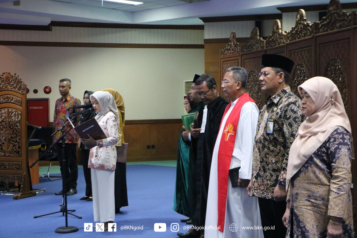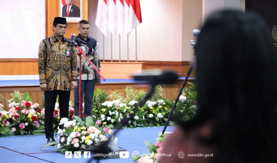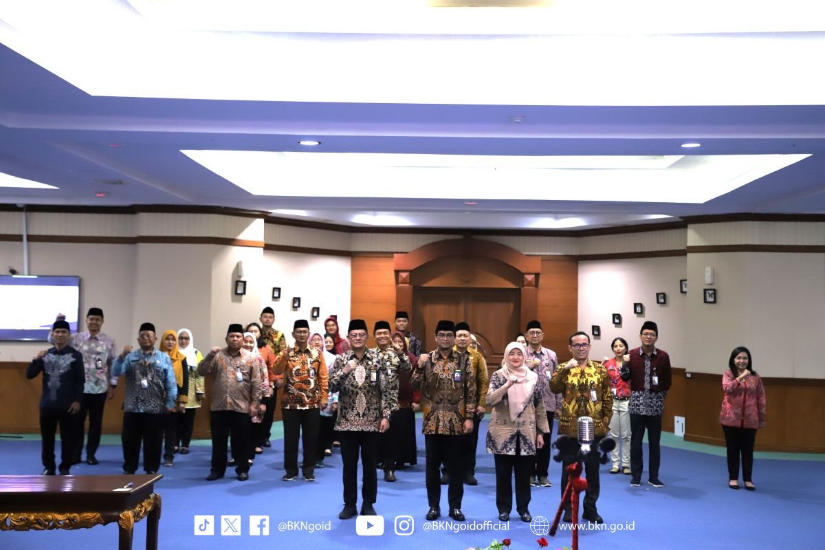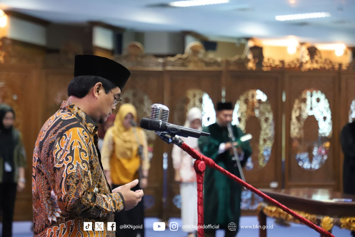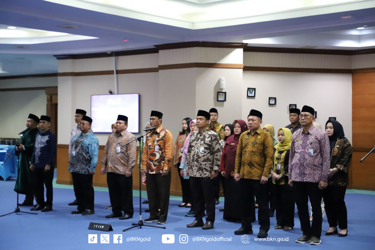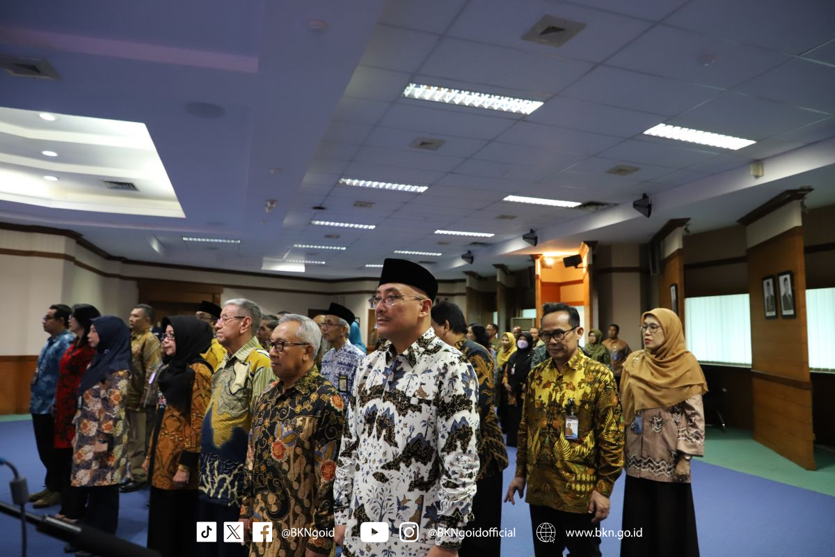 Jakarta – Humas BKN, Plt Kepala Badan Kepegawaian Negara (BKN), Haryomo Dwi Putranto secara resmi melantik dan mengambil sumpah jabatan 2 (dua) Pejabat Fungsional Utama, 7 (tujuh) Pejabat Jabatan Pimpinan Tinggi (JPT) Pratama, 1 (satu) Pejabat Administrator, 5 (lima) Pejabat Pengawas, dan 10 (sepuluh) Pejabat Fungsional Ahli Pertama di Lingkungan Badan Kepegawaian Negara, Selasa (17/10/2023). Acara tersebut berlangsung secara luring di Aula Kantor Pusat BKN Jakarta.