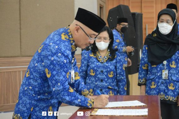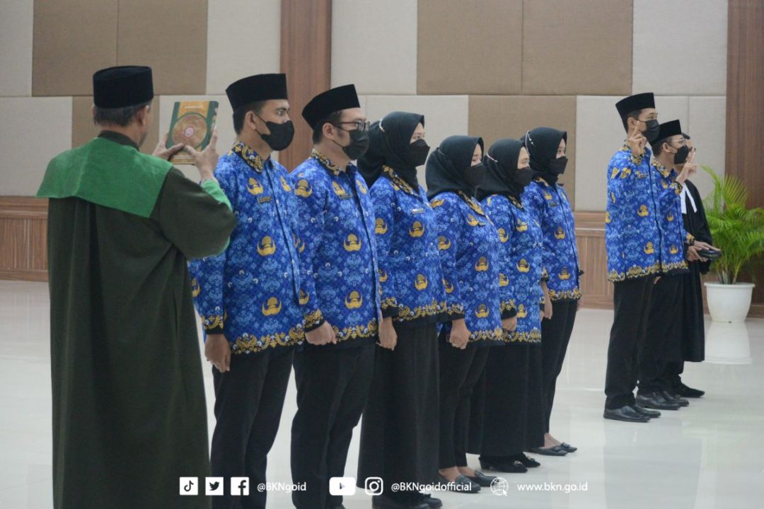 Jakarta – Humas BKN, Plt. Kepala BKN Bima Haria Wibisana melakukan pengambilan sumpah Calon Pegawai Negeri Sipil (CPNS) menjadi Pegawai Negeri Sipil (PNS) terhadap 8 (delapan) orang pegawai yang ditempatkan di lingkungan Kantor Regional (Kanreg) V BKN Jakarta. Adapun satu di antaranya merupakan CPNS lulusan PKN STAN formasi tahun 2021.