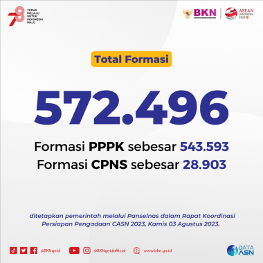 Jakarta – Humas BKN, Pegawai Pemerintah dengan Perjanjian Kerja (PPPK) menjadi prioritas kebutuhan seleksi calon ASN tahun 2023 dengan alokasi sebesar 543.593 dari total formasi 572.496 yang ditetapkan pemerintah melalui Panita Seleksi Nasional atau Panselnas. Sementara kebutuhan pengadaan bagi Calon Pegawai Negeri Sipil (CPNS) dialokasikan sebesar 28.903 dari total formasi.