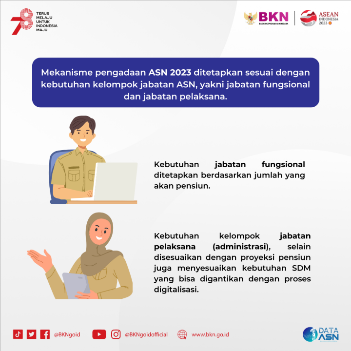 Berdasarkan kebutuhan ASN yang terdiri dari PNS dan PPPK untuk seleksi CASN tahun ini, Plt. Kepala BKN Haryomo Dwi Putranto menyampaikan mekanisme pengadaan ASN 2023 ditetapkan sesuai dengan kebutuhan kelompok jabatan ASN, yakni jabatan fungsional dan jabatan pelaksana. Kebutuhan jabatan fungsional ditetapkan sesuai dengan jumlah pegawai yang akan pensiun. Sementara untuk kelompok jabatan pelaksana (administrasi), selain disesuaikan dengan proyeksi pensiun pegawai juga menyesuaikan kebutuhan SDM yang bisa digantikan dengan proses digitalisasi.