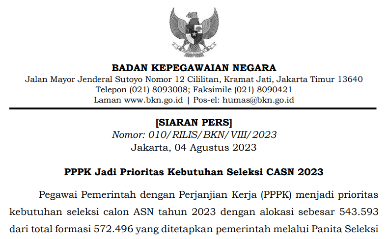 Pegawai Pemerintah dengan Perjanjian Kerja (PPPK) menjadi prioritas kebutuhan seleksi calon ASN tahun 2023 dengan alokasi sebesar 543.593 dari total formasi 572.496 yang ditetapkan pemerintah melalui Panita Seleksi Nasional atau Panselnas. Sementara kebutuhan pengadaan bagi Calon Pegawai Negeri Sipil (CPNS) dialokasikan sebesar 28.903 dari total formasi.