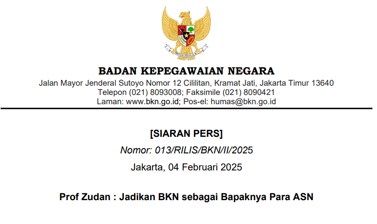 Kepala Badan Kepegawaian Negara (BKN) Prof. Zudan Arif menyampaikan bahwa BKN harus mampu menjadi bapaknya para ASN. Pernyataan ini disampaikan pada Apel Pagi di lingkungan BKN, Senin (3/02/2025) secara daring. “Seperti keluarga inti, ada bapak dan anak, ASN adalah anaknya dan BKN sebagai Bapaknya. Selayaknya sosok Bapak, BKN diharapkan dapat membantu menyelesaikan masalah-masalah kepegawaian yang dihadapi para ASN,” imbuh Kepala BKN.