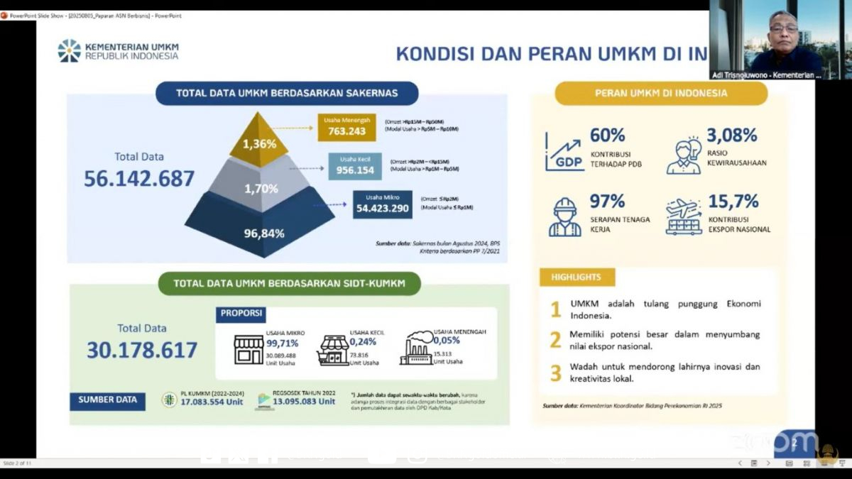 Pada kesempatan yang sama, Asisten Deputi Pembinaan Jabatan Fungsional Pengembang Kewirausahaan Kementerian UMKM, yakni Adi Trisnojuwono selaku narasumber webinar KORPRI kali ini, menerangkan bahwa ASN dapat mulai berbisnis untuk meningkatkan kesejahteraan keluarga, mengoptimalikan potensi diri, menumbuhkan jiwa kewirausahaan, persiapan untuk masa pensiun, dan diperbolehkan oleh peraturan ASN selama mengikuti etika dalam berbisnis. Senada dengan itu, Assistant Vice President PT. Bank Rakyat Indonesia (Persero) Tbk., Debby Haryanti menyampaikan kesiapan peran BRI selaku sektor perbankan dalam pembiayaan usaha untuk para ASN.