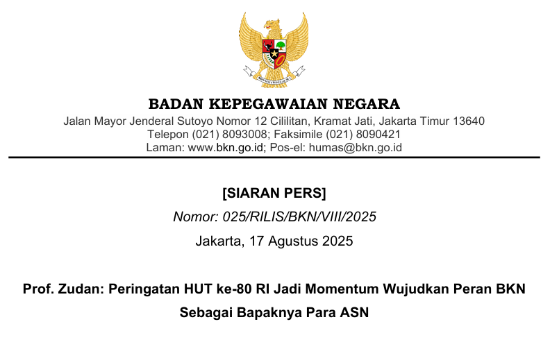 Dalam puncak peringatan HUT Kemerdekaan ke-80 Republik Indonesia, Kepala Badan Kepegawaian Negara (BKN) Prof. Zudan menegaskan komitmennya menjadikan peran BKN sebagai “Bapaknya Para ASN” untuk melanjutkan semangat perjuangan melalui tata kelola manajemen ASN yang mendukung program Asta Cita Presiden dan Wakil Presiden, serta turut memastikan peran ASN dalam mewujudkan visi-misi Kepala Daerah.