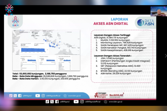 Terkait progres penggunaan ASN Digital, Deputi BKN Bidang Sistem Informasi dan Digitalisasi Manajemen ASN, Suharmen menyebutkan per-tanggal 3 September 2025, total kunjungan layanan Informasi Digital BKN mencapai 53.893.692 kunjungan dengan 2.188.758 pengguna dalam sebulan terakhir. Rata-rata kunjungan mingguan mencapai 26.946.846 kunjungan dan 1.289.790 pengguna. Adapun rata-rata kunjungan harian mencapai 3.110.010 kunjungan dan 250.616 pengguna. Sementara total jumlah keseluruhan pengguna sistem ASN Digital sudah hampir 5 juta, tepatnya 4,8 juta pengguna.