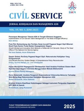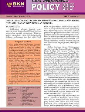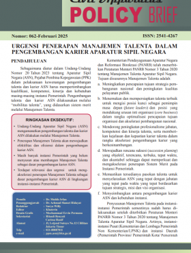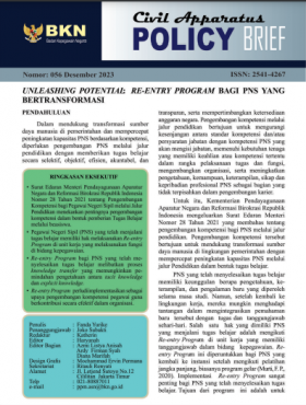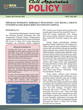 SemuaBuku SakuBuletinFAQJurnal Civil ServicePanduanPolicy BriefStatistik ASNBuku Statistik Aparatur Sipil Negara Semester II 2025Statistik ASNBaca SelengkapnyaKepegawaian Negara Edisi 1/2026BuletinBaca SelengkapnyaJurnal Civil Service Vol 19 No. 2, November 2025Jurnal Civil ServiceBaca SelengkapnyaFAQ Kenaikan Pangkat Penyesuaian IjazahBuku SakuBaca SelengkapnyaFAQ Kenaikan Pangkat Jabatan Fungsional BKN 2025Buku SakuBaca SelengkapnyaPanduan Pengisian Data Usul Penetapan NIP CASNPanduanBaca SelengkapnyaKenaikan Pangkat bagi Pegawai Negeri Sipil yang Menduduki Jabatan Struktural dan Pangkatnya Masih Satu Tingkat di bawah Jenjang Pangkat Terendah yang ditentukan untuk Jabatan ituBuku SakuBaca SelengkapnyaJurnal Civil Service Vol 19 No.1, Juni 2025Jurnal Civil ServiceBaca SelengkapnyaBuku Statistik Aparatur Sipil Negara Semester I 2025Statistik ASNBaca SelengkapnyaPolicy Brief Juni 2025Policy BriefBaca SelengkapnyaPolicy Brief April 2025Policy BriefBaca SelengkapnyaTata Cara Pemberian Cuti Pegawai Pemerintah dengan Perjanjian Kerja (PPPK)Buku SakuBaca SelengkapnyaTata Cara Pemberian Cuti Pegawai Negeri Sipil (PNS)Buku SakuBaca SelengkapnyaPolicy Brief Februari 2025Policy BriefBaca SelengkapnyaBuku Statistik Aparatur Sipil Negara Semester II 2024Statistik ASNBaca SelengkapnyaJurnal Civil Service Vol 18 No.1 Juni 2024Jurnal Civil ServiceBaca SelengkapnyaBuku Profil Jabatan Fungsional Tahun 2024Buku SakuBaca SelengkapnyaPolicy Brief Oktober 2024Policy BriefBaca SelengkapnyaBuku Statistik Aparatur Sipil Negara Semester I 2024Statistik ASNBaca SelengkapnyaPolicy Brief Agustus 2024Policy BriefBaca SelengkapnyaBuku Statistik Aparatur Sipil Negara Semester II 2023Statistik ASNBaca SelengkapnyaPolicy Brief Juni 2024Policy BriefBaca SelengkapnyaPolicy Brief April 2024Policy BriefBaca SelengkapnyaBuku Panduan Teknis Peraturan BKN Nomor 3 Tahun 2023Buku SakuBaca SelengkapnyaPolicy Brief Februari 2024Policy BriefBaca SelengkapnyaPolicy Brief Desember 2023Policy BriefBaca SelengkapnyaTata Cara Pembayaran dan Penghentian Tunjangan Jabatan FungsionalFAQBaca SelengkapnyaPolicy Brief Oktober 2023Policy BriefBaca SelengkapnyaBuku Statistik Aparatur Sipil Negara Semester I 2023Statistik ASNBaca SelengkapnyaPolicy Brief Agustus 2023Policy BriefBaca SelengkapnyaPolicy Brief Juni 2023Policy BriefBaca SelengkapnyaPolicy Brief April 2023Policy BriefBaca SelengkapnyaPolicy Brief Februari 2023Policy BriefBaca SelengkapnyaTampilkan lebih banyak