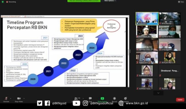 Pada kesempatan itu Imas menguraikan timeline program percepatan reformasi birokrasi BKN yang sudah ditetapkan melalui Road Map Reformasi Birokrasi BKN 2020-2024. Adapun program percepatan reformasi birokrasi BKN secara keseluruhan mencakup transformasi kelembagaan, digitalisasi pelayanan publik, redistribusi ASN, sistem seleksi dan promosi terbuka, peningkatan profesionalitas ASN, peningkatan kesejahteraan ASN, e-Government, peningkatan kompetensi SDM dan efisiensi penggunaan sumber daya.