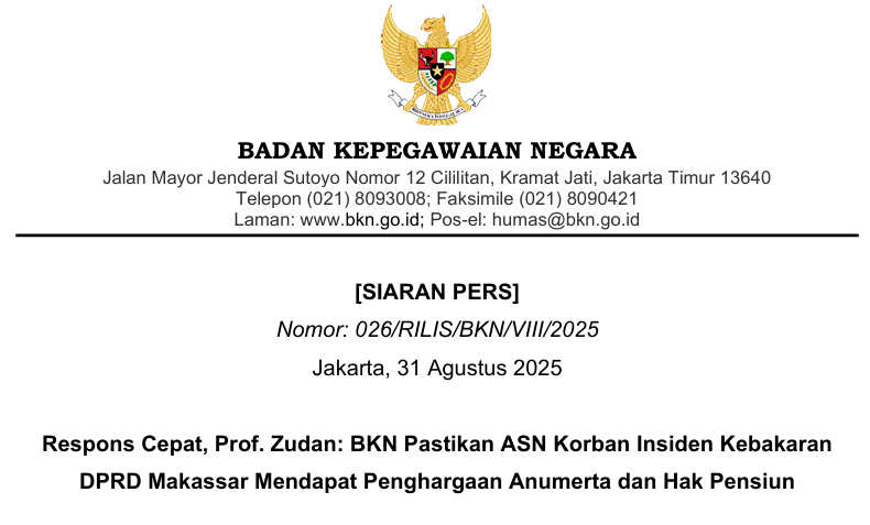 “Sebagai Kepala BKN mewakili institusi dan seluruh komponen ASN di Indonesia, saya ungkapkan duka cita yang mendalam bagi pegawai pemerintah yang menjadi korban dalam insiden tersebut, terutama bagi pihak keluarga korban. Mereka adalah contoh Aparatur Sipil negara yang berdedikasi bagi bangsa dalam kondisi apapun. Negara akan memastikan ASN yang meninggal dunia tersebut mendapatkan penghargaan sepantasnya atas dedikasi mereka,” ungkapnya, Minggu (31/08/2025) di Jakarta.
