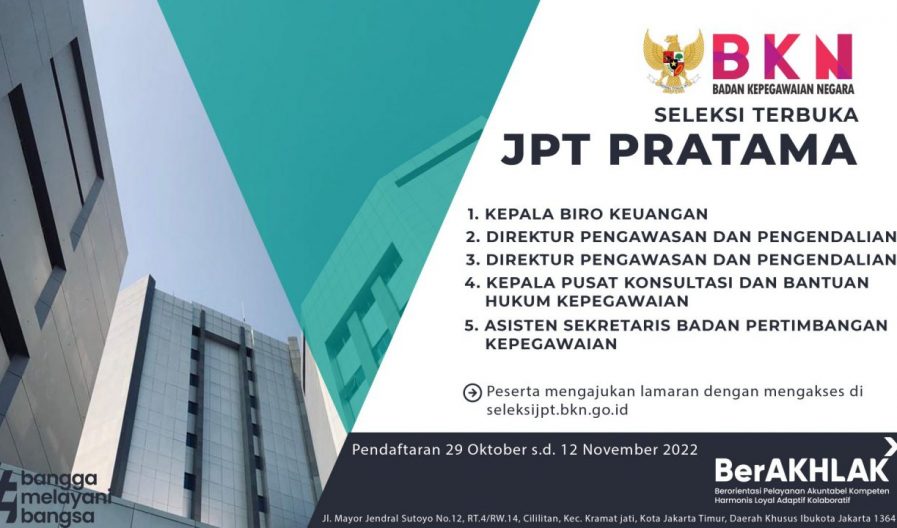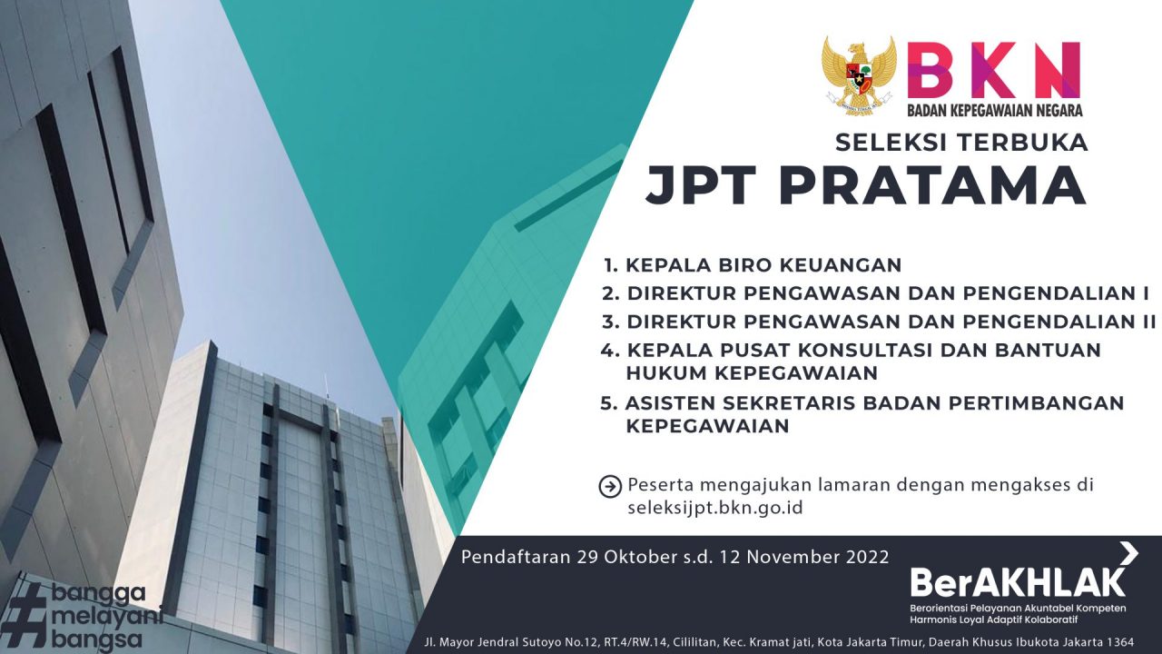 Dalam rangka pengisian Jabatan Pimpinan Tinggi Pratama Badan Kepegawaian Negara Tahun 2022, sesuai dengan Undang-Undang Nomor 5 Tahun 2014 tentang Aparatur Sipil Negara, Peraturan Pemerintah Nomor 11 Tahun 2017 tentang Manajemen Pegawai Negeri Sipil sebagaimana telah diubah dengan Peraturan Pemerintah Nomor 17 Tahun 2020, Peraturan Menteri Pendayagunaan Aparatur Negara dan Reformasi Birokrasi Nomor 15 Tahun 2019 tentang Pengisian Jabatan Pimpinan Tinggi Secara Terbuka dan Kompetitif di Lingkungan Instansi Pemerintah, Surat Edaran Menteri Pendayagunaan Aparatur Negara dan Reformasi Birokrasi Nomor: 52 Tahun 2020 tentang Pelaksanaan Pengisian Jabatan Pimpinan Tinggi secara Terbuka dan Kompetitif di Lingkungan Instansi Pemerintah dalam Kondisi Kedaruratan Kesehatan Masyarakat Corona Virus Disease 2019 (Covid-19), dan Surat Edaran Kepala Badan Kepegawaian Negara Nomor: 15/SE/V/2020 tentang Tata Cara Pelaksanaan Penilaian Kompetensi Jabatan Pimpinan Tinggi melalui Media Daring pada Masa Kedaruratan Kesehatan Masyarakat Akibat Corona Virus Disease 2019 (Covid-19), dengan ini kami mengundang para Pegawai Negeri Sipil (PNS) yang memenuhi syarat untuk mengikuti proses seleksi terbuka pengisian Jabatan Pimpinan Tinggi Pratama Badan Kepegawaian Negara Tahun 2022, dengan ketentuan sebagaimana terlampir Pengumuman Seleksi Terbuka JPTP BKN Tahun 2022