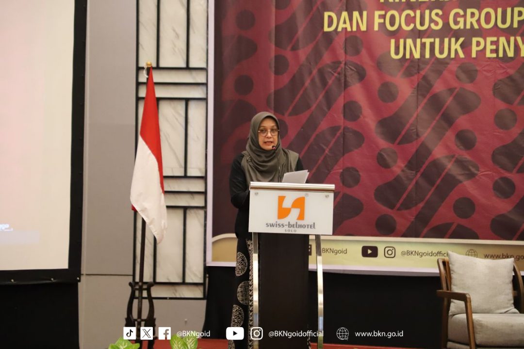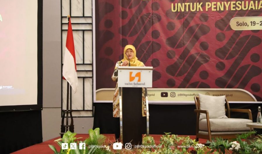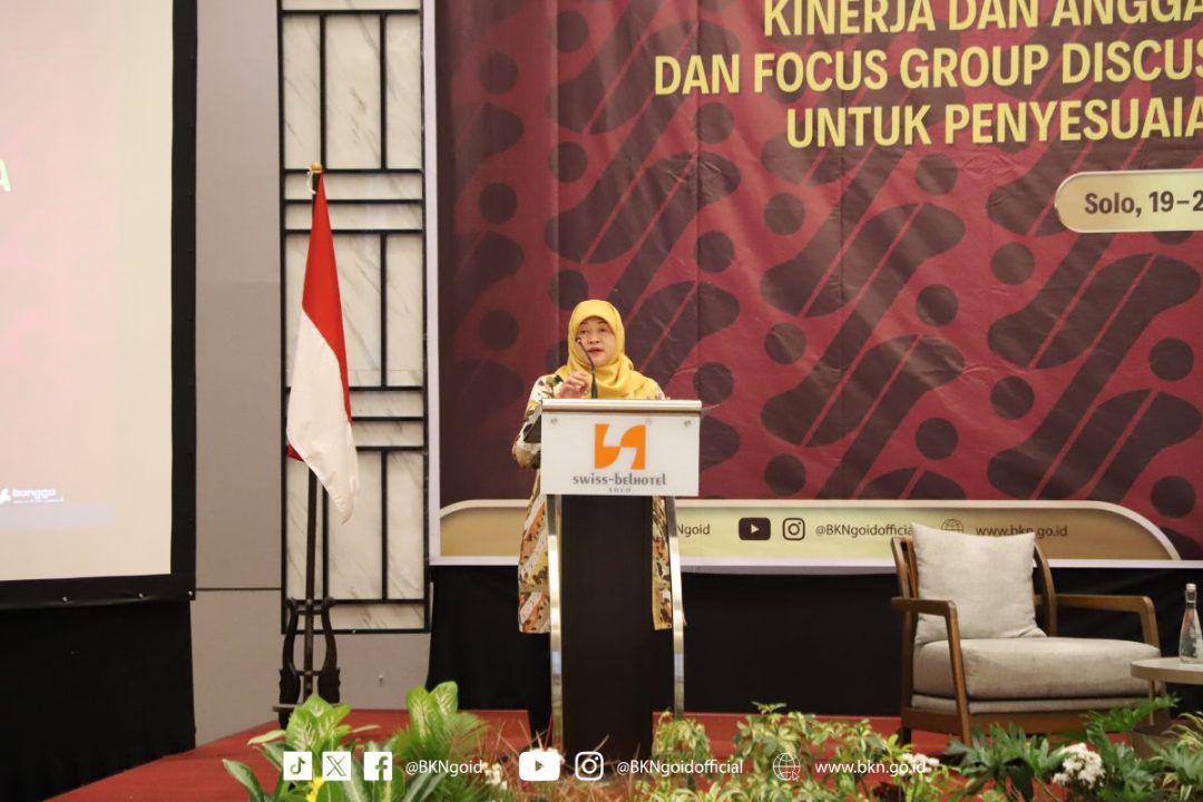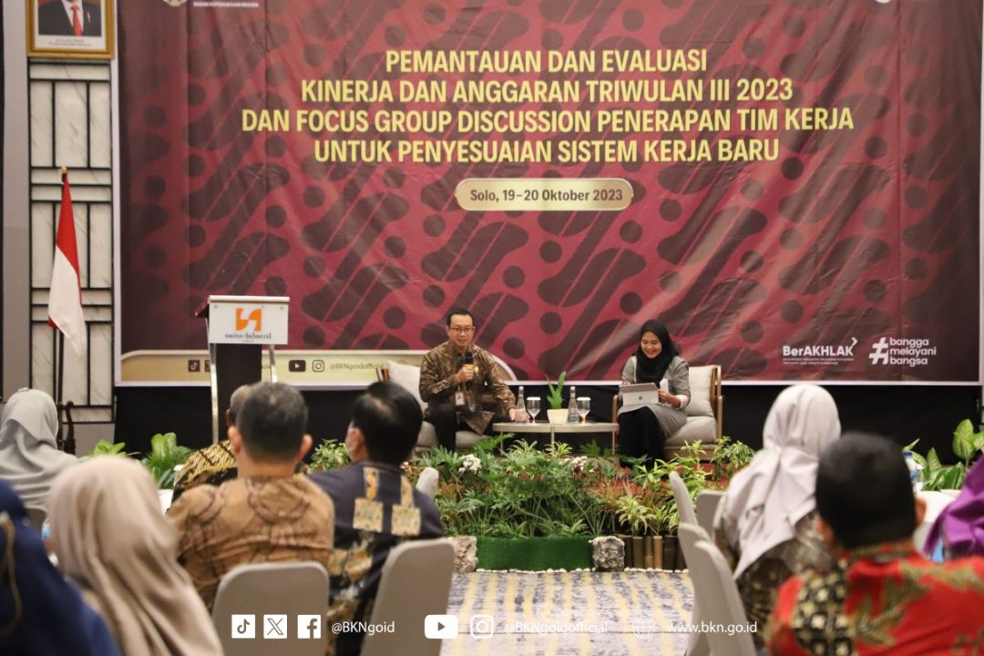 Solo – Humas BKN, “Penyederhanaan birokrasi adalah prioritas Presiden Indonesia, Joko Widodo dalam periode kedua masa pemerintahannya. Namun perlu kita perhatikan, Penyederhanaan Birokrasi tidak hanya menghapus struktur birokrasi dan mengalihkan Pejabat Administrasi menjadi Pejabat Fungsional, namun juga perlu dilakukan melalui perubahan sistem kerja,” ujar Sekretaris Utama BKN, Imas Sukmariah dalam arahannya pada Kegiatan Diskusi Terpumpun Penerapan Tim Kerja untuk Penyesuaian Sistem Kerja Baru yang dilaksanakan pada Jumat (20/10) di Swiss-Bel Hotel, Solo.