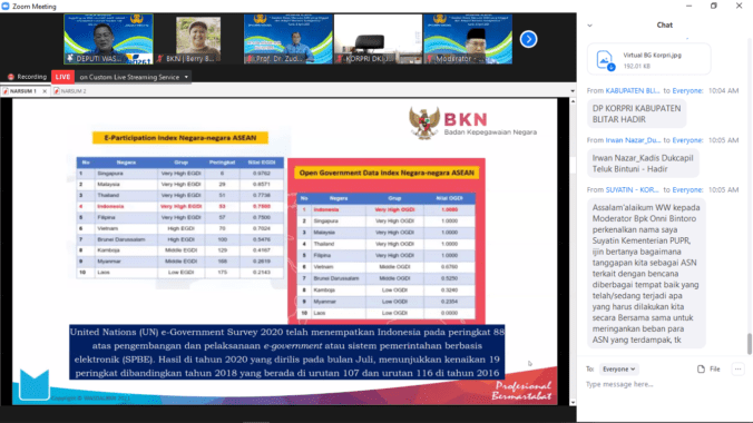 Hal itu disampaikan Deputi Bidang Pengawasan dan Pengendalian Kepegawaian Badan Kepegawaian Negara (BKN), Otok Kuswandaru, saat Webinar Sumber Daya Manusia ASN yang Unggul dan Adaptif Berbasis Kompetensi oleh Dewan Pengurus Korpri Nasional, melalui media daring, Kamis (8/4/2021). Menurutnya, skor itu menempatkan Indonesia pada posisi teratas dibandingkan negara-negara ASEAN lainnya. “Namun yang menjadi tantangan agar ASN dapat tetap adaptif dan produktif, sekaligus mempertahankan capaian tersebut adalah pandemi dan fenomena disruptif digital seperti saat ini,” terangnya.
