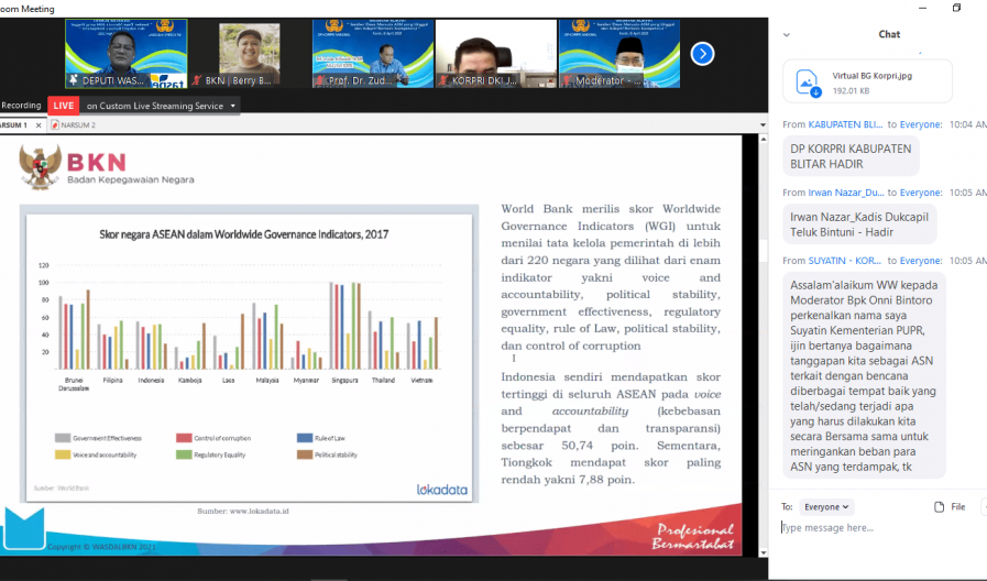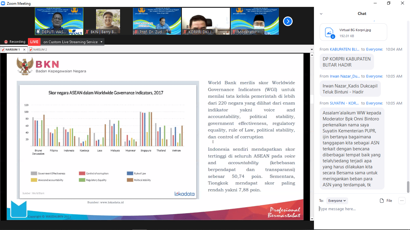Jakarta – Humas BKN, Pada 2017, World Bank merilis skor Worldwide Governance Indicators (WGI) bagi Indonesia sebesar 50,74% untuk aspek indikator kebebasan berpendapat dan transparansi. WGI sendiri dilaksanakan World Bank dalam rangka menilai tata kelola pemerintah di lebih dari 220 negara yang dilihat dari enam indikator yakni voice and accountability, political stability, government effectiveness, regulatory equality, rule of law, political stability, dan control of corruption.