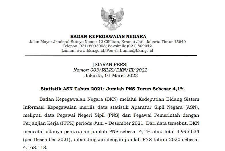 Badan Kepegawaian Negara (BKN) melalui Kedeputian Bidang Sistem Informasi Kepegawaian merilis data statistik Aparatur Sipil Negara (ASN), meliputi data Pegawai Negeri Sipil (PNS) dan Pegawai Pemerintah dengan Perjanjian Kerja (PPPK) periode Juni – Desember 2021. Dari data tersebut, BKN mencatat adanya penurunan jumlah PNS sebesar 4,1% atau total 3.995.634 (per Desember 2021), dibandingkan dengan jumlah PNS tahun 2020 sebesar