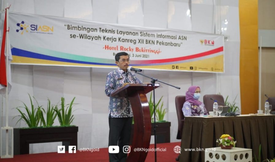 Padang – Humas BKN, Sejak peluncuran Pemutakhiran Data ASN dan Pejabat Pimpinan Tinggi Non-ASN pada 24 Mei 2021, Badan Kepegawaian Negara (BKN) melalui Kedeputian Sistem Informasi Kepegawaian melakukan Bimbingan Teknis Layanan Sistem Informasi ASN, termasuk kepada seluruh Instansi yang berada di wilayah kerja Kantor Regional (Kanreg) BKN. Wakil Kepala BKN, Supranawa Yusuf yang berkesempatan menghadiri Bimtek Layanan Sistem Informasi ASN se-Wilayah Kerja Kanreg XII BKN Pekanbaru pada Kamis, (03/6/2021) di Provinsi Sumatera Barat mengajak partisipasi seluruh Satuan Kerja wilker Kanreg Pekanbaru untuk secara bersinergi melakukan optimalisasi kualitas data ASN untuk menimalisasi terjadinya ketidakuratan.