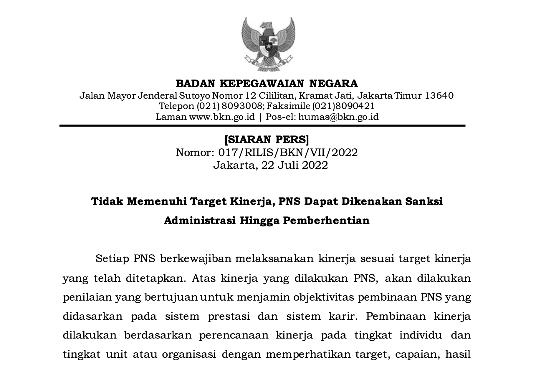 Nomor: 017/RILIS/BKN/VII/2022 Jakarta, 22 Juli 2022