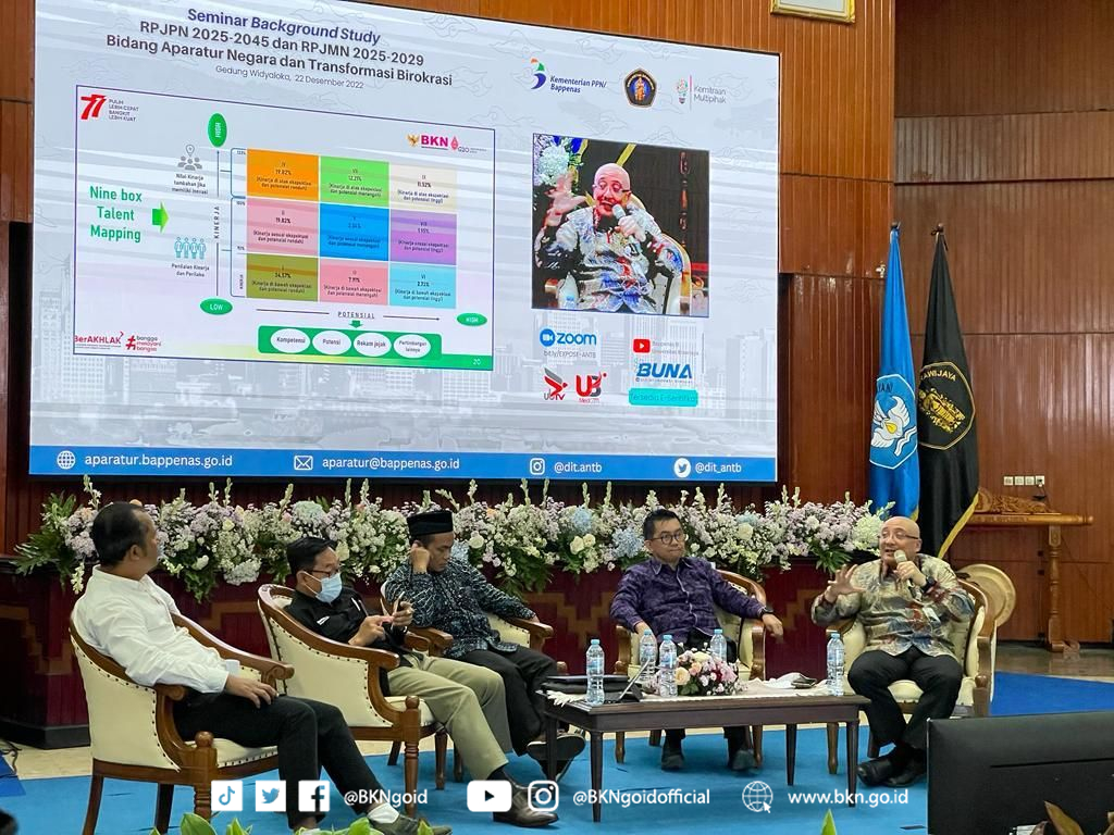 “Untuk menjawab kebutuhan masa depan Reformasi Birokrasi, kita tidak bisa hanya berfokus pada fundamental proses bisnis saja, tapi digital mindset menjadi syarat mutlak bagi para SDM-nya,” terangnya saat menjadi pembicara Seminar Background Study Rencana Pembangunan Jangka Panjang Nasional (RPJPN) 2025 – 2045 dan Rencana Pembangunan Jangka Menengah Nasional (RPJMN) 2025 – 2029 bidang Aparatur Negara dan Transformasi Birokrasi, Kamis (22/12/2022) di Universitas Brawijaya, Kota Malang, Jawa Timur.