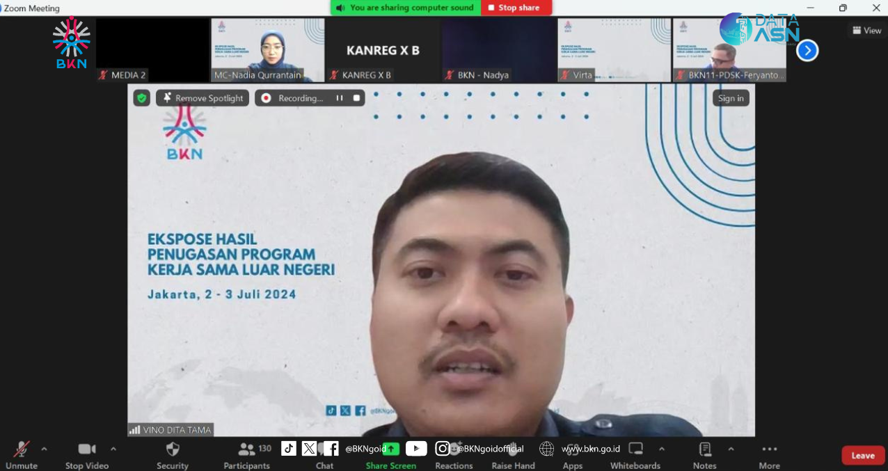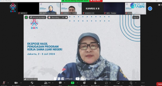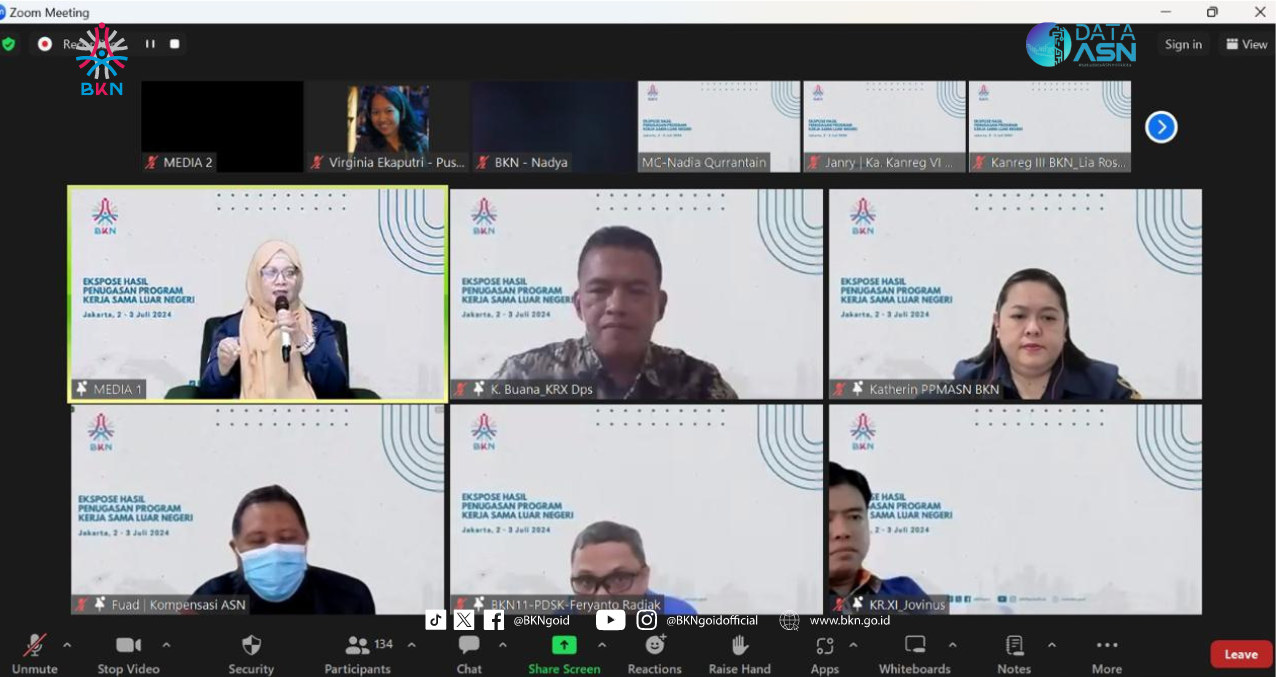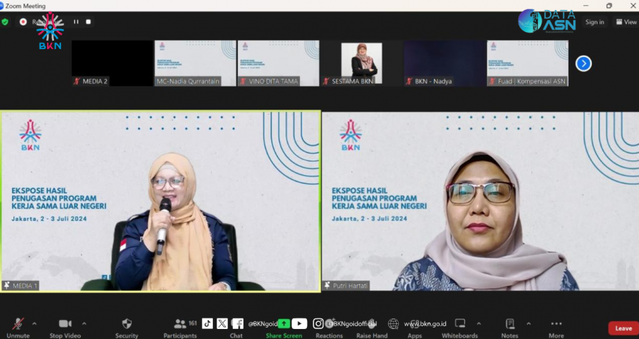 Jakarta – Humas BKN, Badan Kepegawaian Negara (BKN) melalui Biro Hubungan Masyarakat, Hukum dan Kerja Sama (BHHK) menyelenggarakan Ekspose Hasil Penugasan Program Kerja Sama Luar Negeri secara daring pada Selasa-Rabu (2-3/07/2024). Ekspose merupakan salah satu bentuk monitoring dan evaluasi penugasan pejabat/pegawai BKN baik secara luring maupun daring melalui keikutsertaan pada workshop, seminar, pelatihan, konferensi, rapat, studi banding, ataupun beasiswa pasca sarjana untuk meningkatkan kapabilitas dan kompetensi di kancah internasional. Pada semester pertama tahun 2024 terdapat 14 (empat belas) program penugasan yang terlaksana, 2 (dua) program pada tahun 2023 dan 12 (dua belas) program pada tahun 2024. Hal tersebut disampaikan oleh Plt. Kepala BHHK, Vino Dita Tama.
