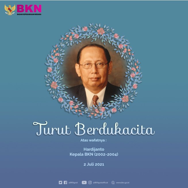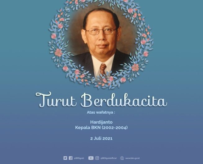Turut Berduka Cita Atas Wafatnya Bapak Hardijanto 02/07/2021 Berita Duka, Publikasi Pimpinan dan Keluarga Besar BKN Turut Berduka Cita atas Meninggalnya: Nama : Hardijanto Jabatan : Kepala BKN (2002-2004) Wafat pada : 02/07/2021 Semoga mendapat tempat terbaik di sisi-Nya. Bagikan tentang ini Tweet Share Share Email Pin It Publikasi Lainnya Pengumuman Hasil Seleksi Administrasi Uji Kompetensi Jabatan Fungsional di Bidang Manajemen ASN Periode Desember 2025 Terbukti Dorong Penguatan Tata Kelola di Daerah, Wali Kota Gorontalo Apresiasi Kebijakan BKN Pro-Karier ASN Kepala BKN Prof. Zudan Ajak Pemda Gorontalo Selaraskan Kinerja dengan Asta Cita Presiden Indeks Data ASN Tembus 99,86, BKN Nilai Pemkot Cirebon Siap Percepat Implementasi Manajemen Talenta ASN