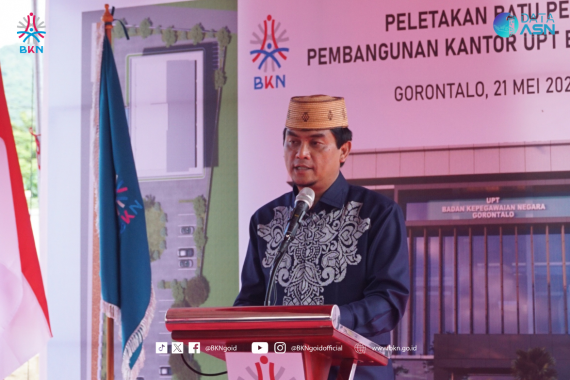 Gorontalo-Humas BKN, Plt. Kepala Badan Kepegawaian Negara (BKN), Haryomo Dwi Putranto menjelaskan bahwa eksistensi Unit Pelaksana Teknis (UPT) BKN tidak hanya mengakomodadi kebutuhan mendasar bagi ASN dan menunjang aksesibilitas bagi pelaksanaan seleksi saja, melainkan ditargetkan pula untuk menjadi Kantor Regional demi mendekatkan layanan manajemen ASN di seluruh Indonesia. Hal ini disampaikan oleh Haryomo dalam sambutannya pada kegiatan Peletakkan Batu Pertama Pembangunan Kantor UPT BKN Gorontalo, Selasa (22/05/2024) di lokasi tanah pembangunan yang terletak di Kec. Kota Timur, Kab. Gorontalo.
