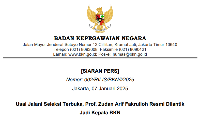 Setelah melalui Seleksi Terbuka Pengisian Jabatan Kepala Badan Kepegawaian Negara (BKN), Prof. Zudan Arif Fakrulloh resmi dilantik menjadi Kepala BKN pada Selasa, (07/01/2025) di Kantor BKN Pusat, Jakarta. Pelantikan ini sekaligus juga sebagai momentum pembaharuan bagi BKN setelah 10 (sepuluh) tahun yang lalu pelantikan Kepala BKN terakhir dilakukan.