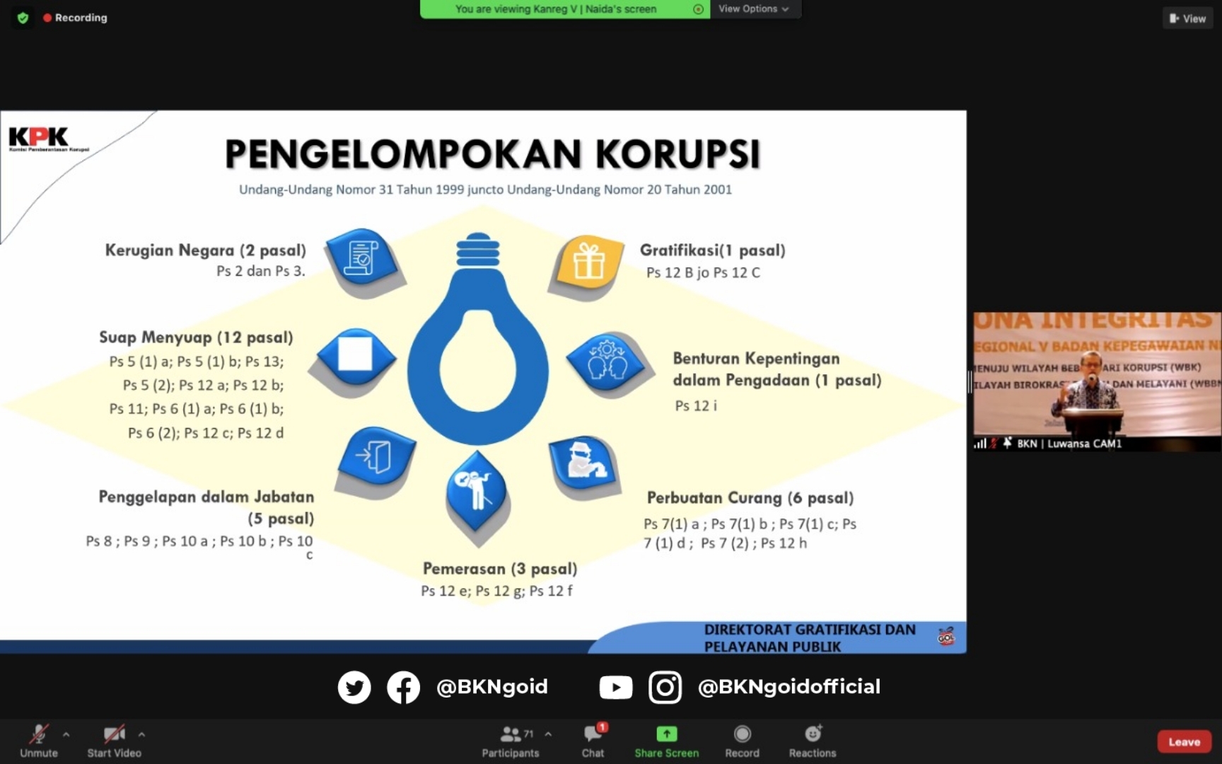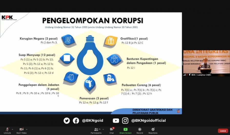 Pada kesempatan yang sama, Bima juga menyerukan bahwa jika kita ingin membangun suatu sistem birokrasi dengan benar, maka ada ethics (norma) dan values (nilai) yang dibangun di sana. “Bagaimana kita bisa membangun birokrasi, sehingga fairness akan terjaga, jika fairness sudah terjaga, maka public trust akan terjadi,” tutupnya. Terakhir, acara ini diikuti oleh sekitar 500 ASN yang hadir secara daring dan luring di empat kawasan Kantor Regional BKN. Dalam acara tersebut dipaparkan materi dari 2 narasumber, yakni dari Komisi Pemberantasan Korupsi (KPK) dan KemenPAN RB, dengan dimoderatori oleh Kepala Kanreg XIII BKN Banda Aceh Ojak Murdani. nsp